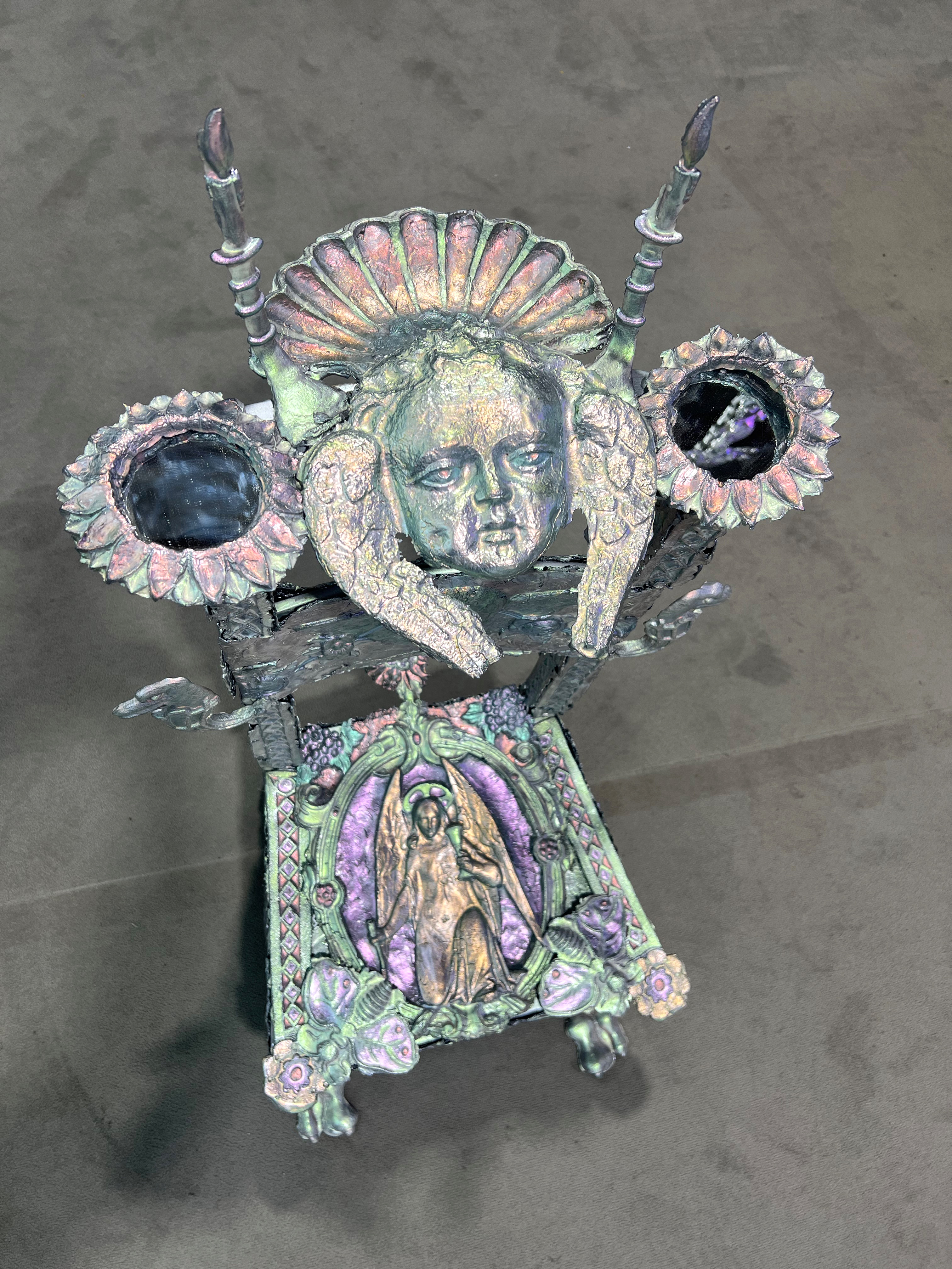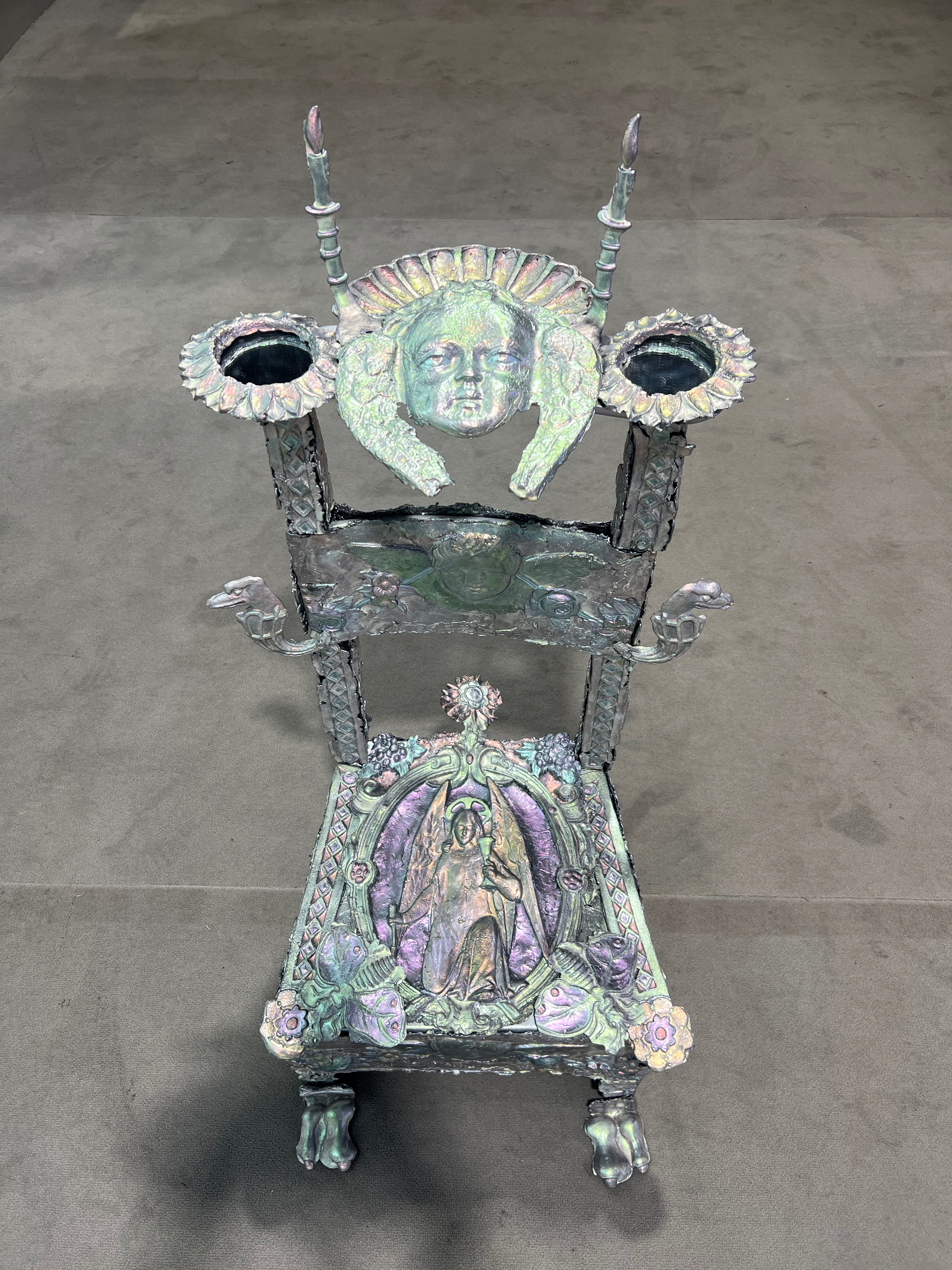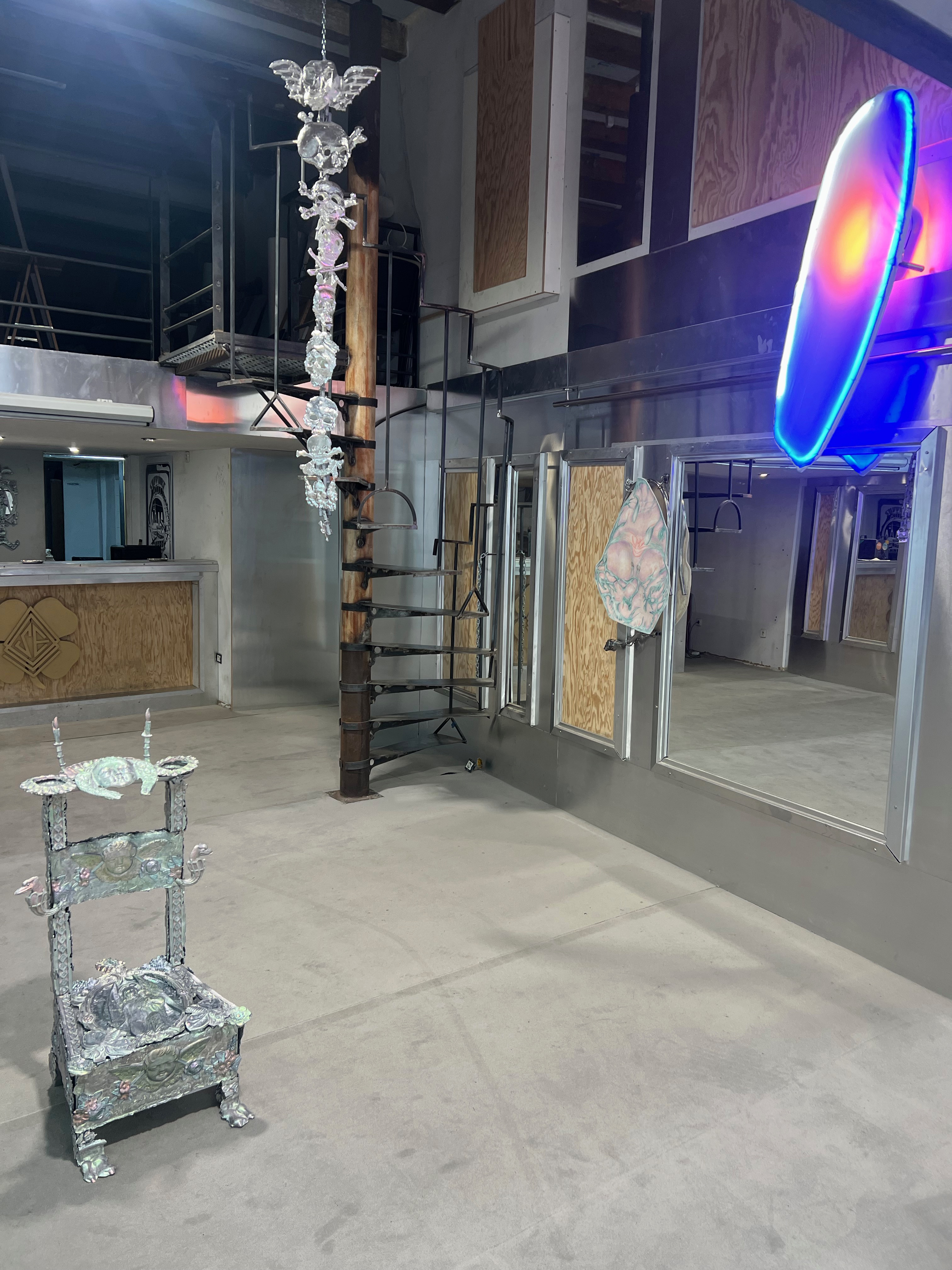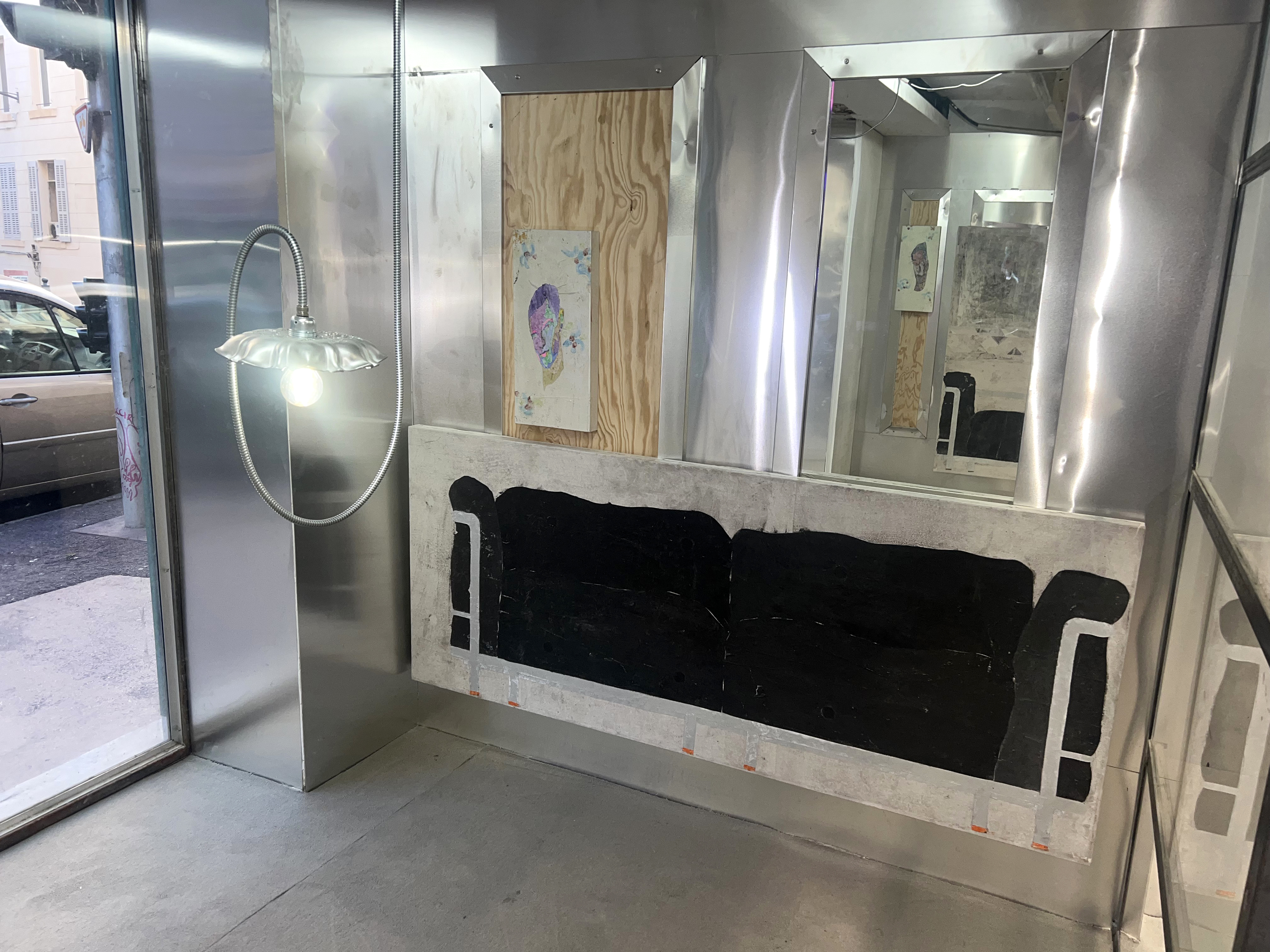 Société Étrange, Marseille 08/01/2026 - 01/02/2026 Une carte blanche à Jean-Baptiste Janisset qui invite Naomi Maury, Antoine Nessi, Paul Paillet Texte de Camille Velluet L’exposition imaginée par Jean-Baptiste Janisset ménage un espace de repos – physique et psychique –, de redescente possible face à une certaine accélération qui parasite nos modes de vie, une perte de repères imposée dans un lieu à la fois clinique et chaleureux. C’est de cette ambivalence dont s’imprègnent les artistes invité·es dans une exposition qui se conçoit comme un asile pour se préserver de maux visibles comme imperceptibles. Il s’agit alors d’ouvrir la voie à une forme d’exorcisme ou d’échappatoire pour se confronter à d’autres temporalités et explorer différents dérivatifs, pratiques, croyances ou stratégies de repli pour habiter ou s’abstraire d’un monde sans dessus dessous. Les fauteuils de Paul Paillet prolongent une série précédente qui évoque des micro-sociétés vivant en vase clos, assises ou allongées dans des canapés, sans réel contact avec l’extérieur. Échos à différentes expériences personnelles et intimes, ses peintures rappellent aussi la salle d’attente, le sas qui précède la consultation ou encore le divan sur lequel on s'épanche. Ces assises, qui par essence impliquent un usage solitaire, tout comme les sculptures lumineuses de l’artiste, suggèrent un espace liminaire, une antichambre entre le lieu domestique suranné et le cabinet du thérapeute. Ces lampes de Paul Paillet résonnent avec les halos luminescents de Naomi Maury. Dérivant de cellules que l’on retrouve chez tous les êtres vivants, ses formes organiques renvoient aux médecines parallèles comme la luminothérapie. Plus largement, la pratique de l’artiste interroge la manière dont nous prenons soin et entretenons les corps pour déjouer leur obsolescence programmée. Naomi Maury étudie comment, dans une logique ultra-tayloriste, la médecine actuelle tend à repousser nos limites physiologiques et en quoi divers objets high-tech viennent prolonger et transformer nos membres de manière quasi prothétique. Les dessins sur gravures d’Antoine Nessi préfigurent les environnements sculpturaux qu’il conçoit. Ils déploient des visions dystopiques qui présagent d’un avenir dans lequel le peuple serait abreuvé d’un lait apte à diffuser une pensée fasciste. Ce liquide coule à flots à travers différents robinets et auges proches de celles présentes dans les abattoirs et les élevages intensifs. Dans cet univers, le mobilier implique une aliénation des corps et tout semble mis en place pour orchestrer un aveuglement des esprits selon un système de pouvoir oppressif. Ces tableaux qui se font le reflet d’un inconscient collectif s’apparentent à des simulations d’un futur à plus ou moins court terme ou d’un présent qui endort nos consciences. Le trône de Jean-Baptiste Janisset émane d’un prie-dieu récupéré aux alentours de Marseille. Témoin d’une histoire à laquelle s'agrègent des fragments de monuments prélevés par l’artiste dans différents lieux souvent liés au culte, cet objet devenu syncrétique revêt divers régimes ornementaux empreints de charges symboliques. Désormais dénué d’une dimension liturgique, il se teinte pourtant d’une force mystique aux vertus curatives. À travers différents registres, les travaux réunis dans ce lieu cultivent une zone de friction au sein de laquelle corps et esprits cheminent entre perte de contrôle et état de veille. De manière plus ou moins équivoque, les pièces participent à la création d’une atmosphère nébuleuse qui permet d’accéder à différents états de conscience. L’exposition aborde la notion de soin dans une dimension tour à tour médicinale et ésotérique. À une époque où le progrès scientifique pousse les corps à toujours plus de performativité, où les substances chimiques font office de loisir récréatif comme de palliatif réconfortant, où une existence sous sédatif paraît presque constituer un mode de vie enviable, L’esprit en thérapie interroge nos manières de nous acclimater à un monde qui semble désynchronisé, entre fuite en avant et quête de guérison.