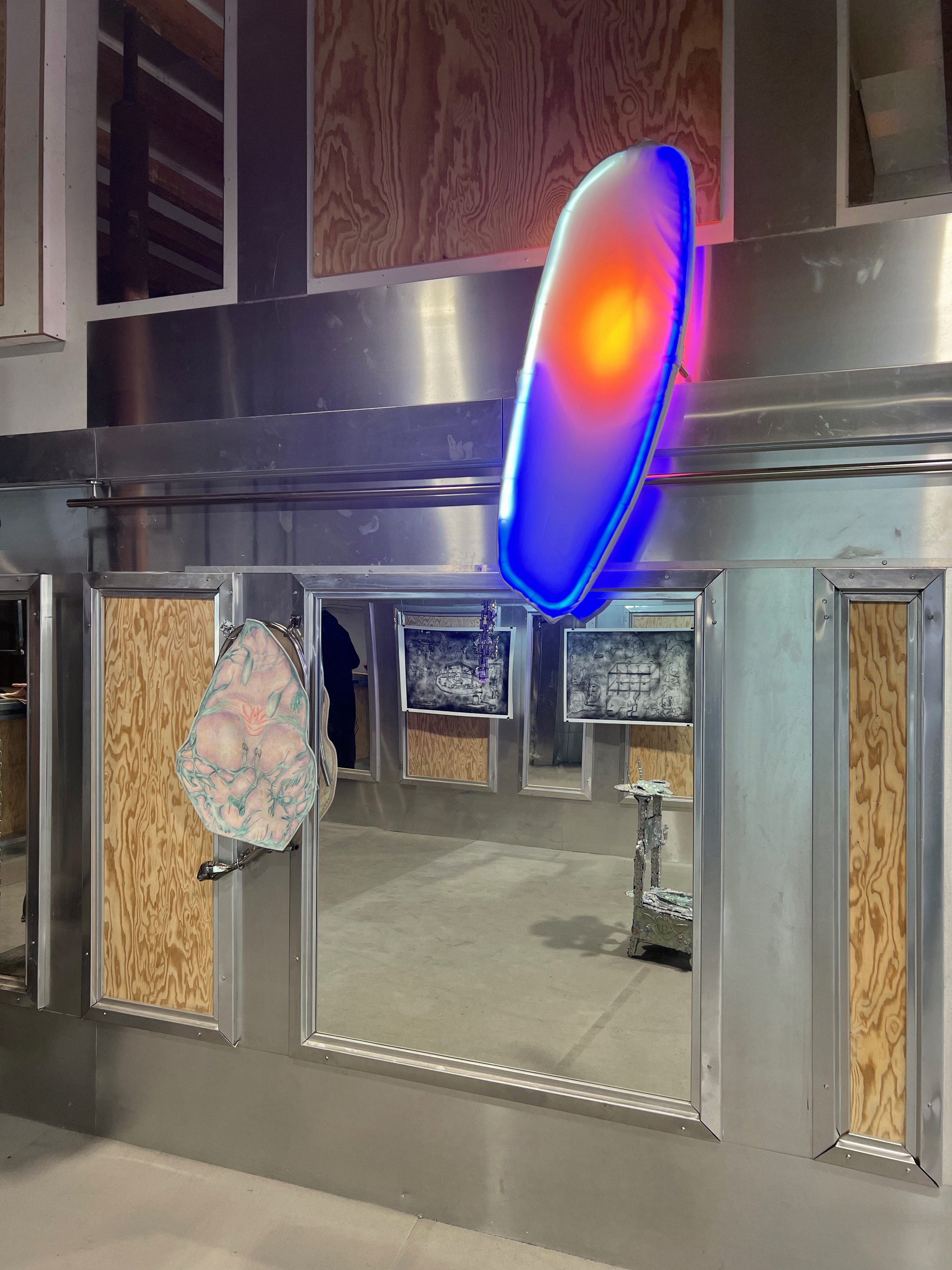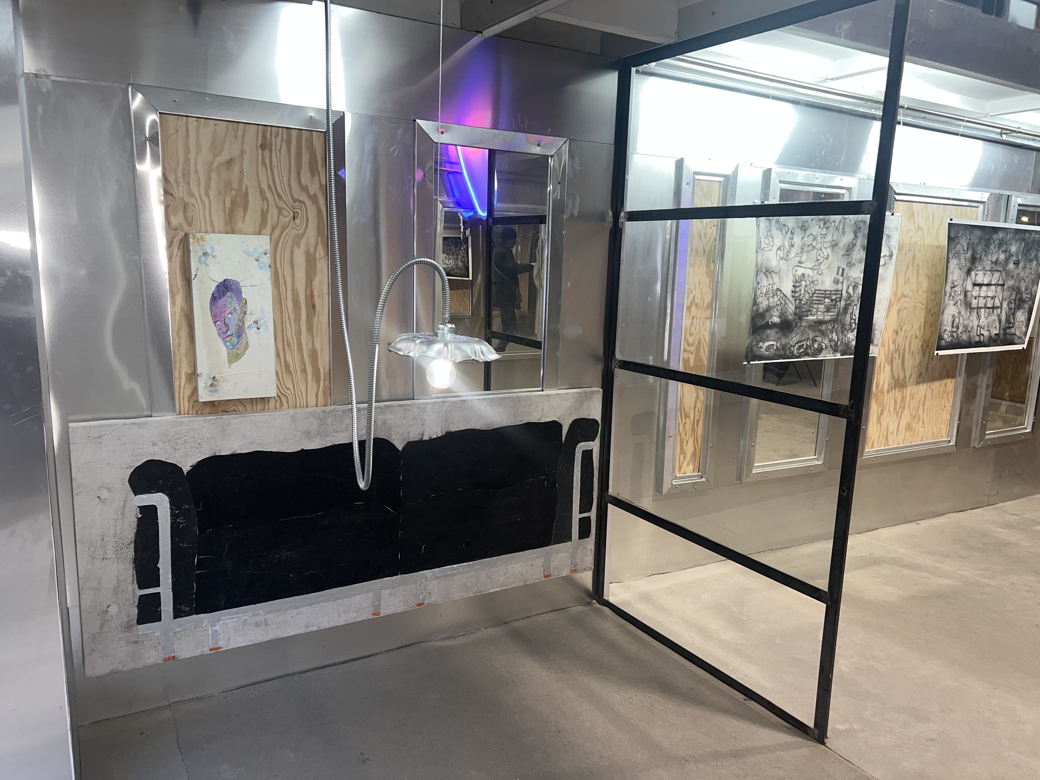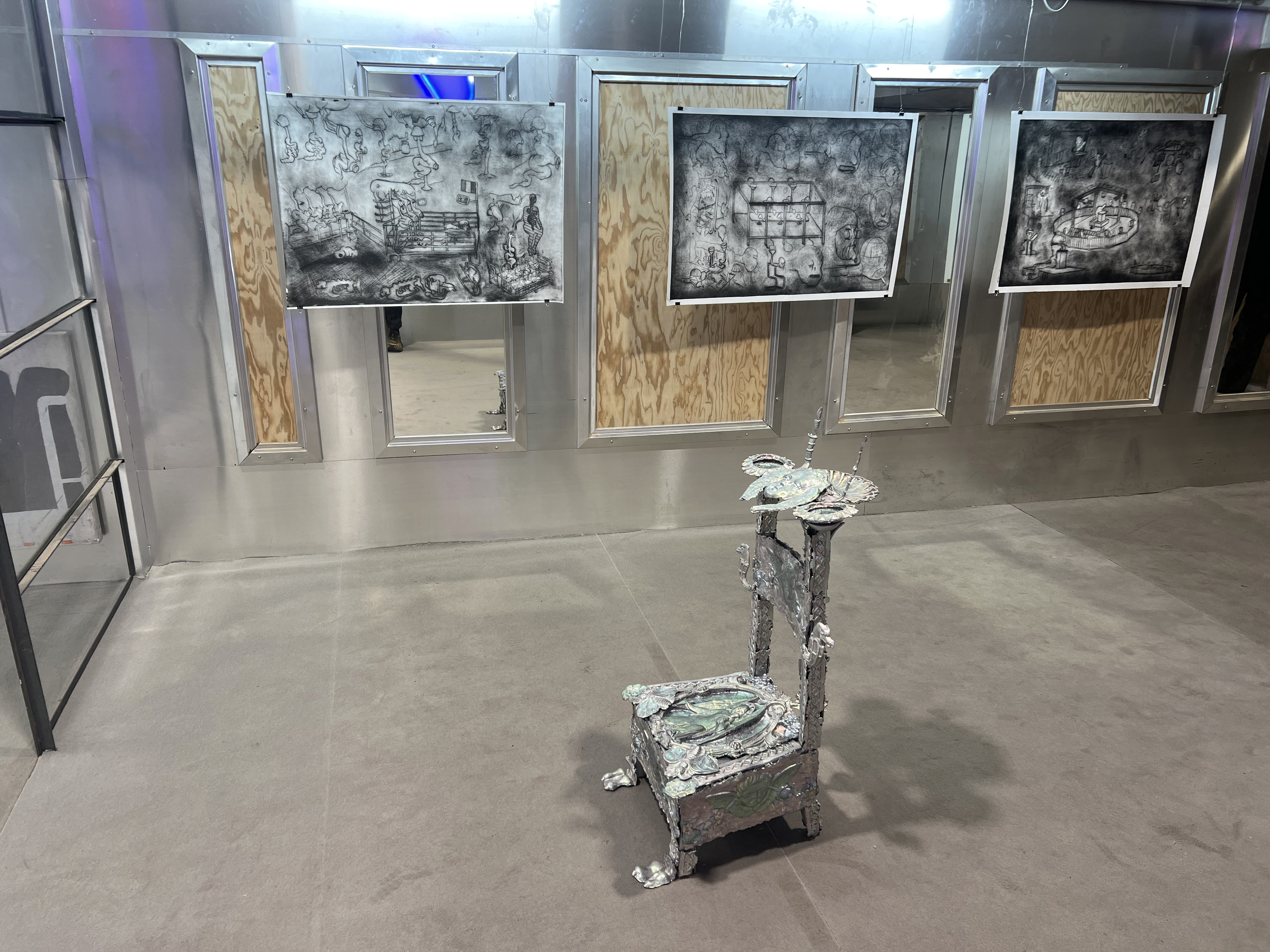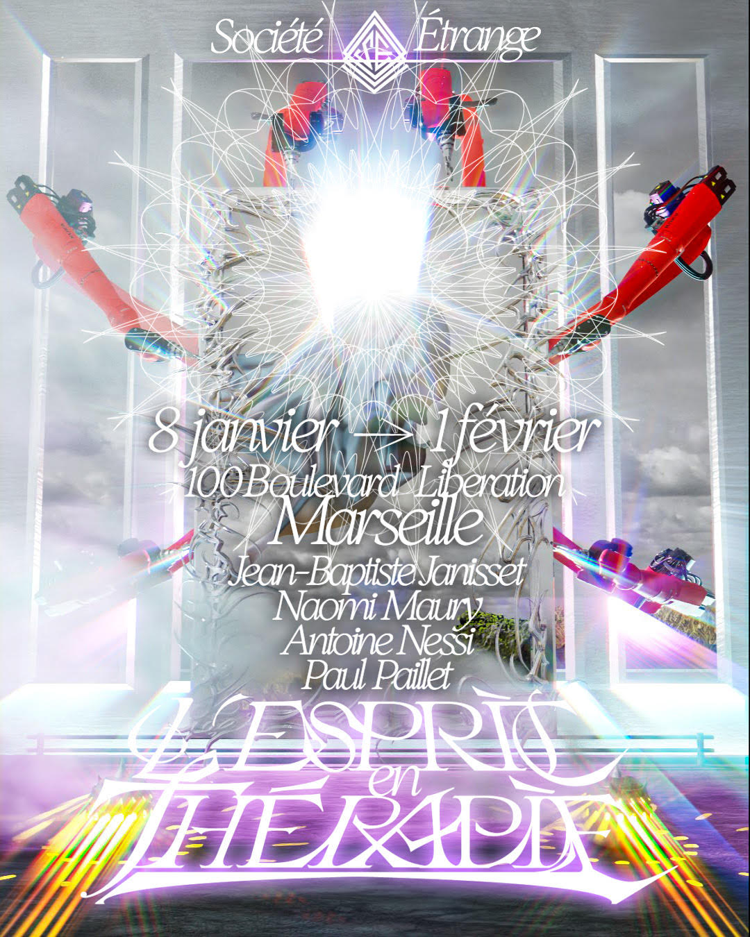 Société Étrange, Marseille 08/01/2026 - 01/02/2026 Une carte blanche à Jean-Baptiste Janisset qui invite Naomi Maury, Antoine Nessi, Paul Paillet Texte de Camille Velluet L’exposition imaginée par Jean-Baptiste Janisset ménage un espace de repos – physique et psychique –, de redescente possible face à une certaine accélération qui parasite nos modes de vie, une perte de repères imposée dans un lieu à la fois clinique et chaleureux. C’est de cette ambivalence dont s’imprègnent les artistes invité·es dans une exposition qui se conçoit comme un asile pour se préserver de maux visibles comme imperceptibles. Il s’agit alors d’ouvrir la voie à une forme d’exorcisme ou d’échappatoire pour se confronter à d’autres temporalités et explorer différents dérivatifs, pratiques, croyances ou stratégies de repli pour habiter ou s’abstraire d’un monde sans dessus dessous. Les fauteuils de Paul Paillet prolongent une série précédente qui évoque des micro-sociétés vivant en vase clos, assises ou allongées dans des canapés, sans réel contact avec l’extérieur. Échos à différentes expériences personnelles et intimes, ses peintures rappellent aussi la salle d’attente, le sas qui précède la consultation ou encore le divan sur lequel on s'épanche. Ces assises, qui par essence impliquent un usage solitaire, tout comme les sculptures lumineuses de l’artiste, suggèrent un espace liminaire, une antichambre entre le lieu domestique suranné et le cabinet du thérapeute. Ces lampes de Paul Paillet résonnent avec les halos luminescents de Naomi Maury. Dérivant de cellules que l’on retrouve chez tous les êtres vivants, ses formes organiques renvoient aux médecines parallèles comme la luminothérapie. Plus largement, la pratique de l’artiste interroge la manière dont nous prenons soin et entretenons les corps pour déjouer leur obsolescence programmée. Naomi Maury étudie comment, dans une logique ultra-tayloriste, la médecine actuelle tend à repousser nos limites physiologiques et en quoi divers objets high-tech viennent prolonger et transformer nos membres de manière quasi prothétique. Les dessins sur gravures d’Antoine Nessi préfigurent les environnements sculpturaux qu’il conçoit. Ils déploient des visions dystopiques qui présagent d’un avenir dans lequel le peuple serait abreuvé d’un lait apte à diffuser une pensée fasciste. Ce liquide coule à flots à travers différents robinets et auges proches de celles présentes dans les abattoirs et les élevages intensifs. Dans cet univers, le mobilier implique une aliénation des corps et tout semble mis en place pour orchestrer un aveuglement des esprits selon un système de pouvoir oppressif. Ces tableaux qui se font le reflet d’un inconscient collectif s’apparentent à des simulations d’un futur à plus ou moins court terme ou d’un présent qui endort nos consciences. Le trône de Jean-Baptiste Janisset émane d’un prie-dieu récupéré aux alentours de Marseille. Témoin d’une histoire à laquelle s'agrègent des fragments de monuments prélevés par l’artiste dans différents lieux souvent liés au culte, cet objet devenu syncrétique revêt divers régimes ornementaux empreints de charges symboliques. Désormais dénué d’une dimension liturgique, il se teinte pourtant d’une force mystique aux vertus curatives. À travers différents registres, les travaux réunis dans ce lieu cultivent une zone de friction au sein de laquelle corps et esprits cheminent entre perte de contrôle et état de veille. De manière plus ou moins équivoque, les pièces participent à la création d’une atmosphère nébuleuse qui permet d’accéder à différents états de conscience. L’exposition aborde la notion de soin dans une dimension tour à tour médicinale et ésotérique. À une époque où le progrès scientifique pousse les corps à toujours plus de performativité, où les substances chimiques font office de loisir récréatif comme de palliatif réconfortant, où une existence sous sédatif paraît presque constituer un mode de vie enviable, L’esprit en thérapie interroge nos manières de nous acclimater à un monde qui semble désynchronisé, entre fuite en avant et quête de guérison.