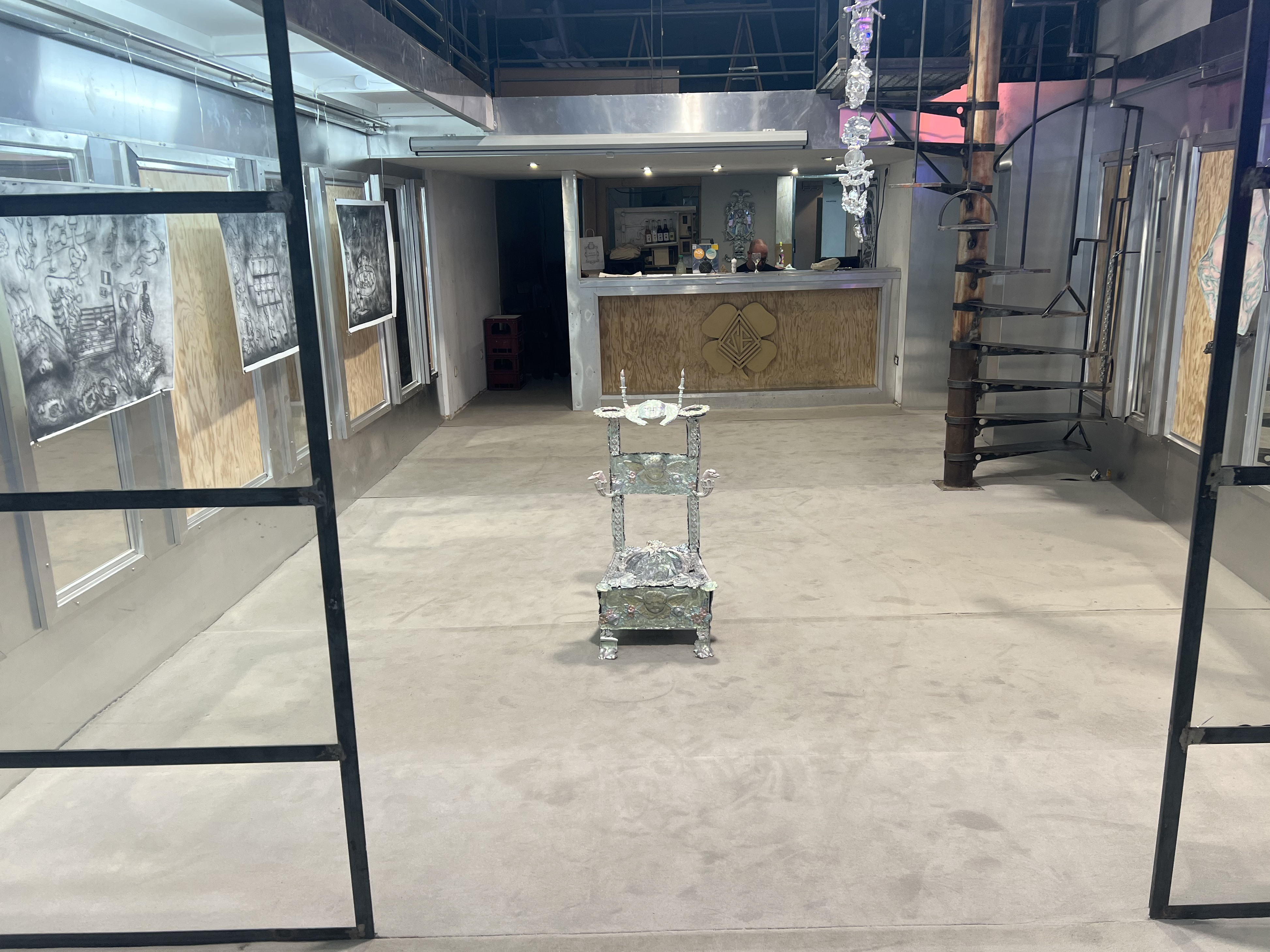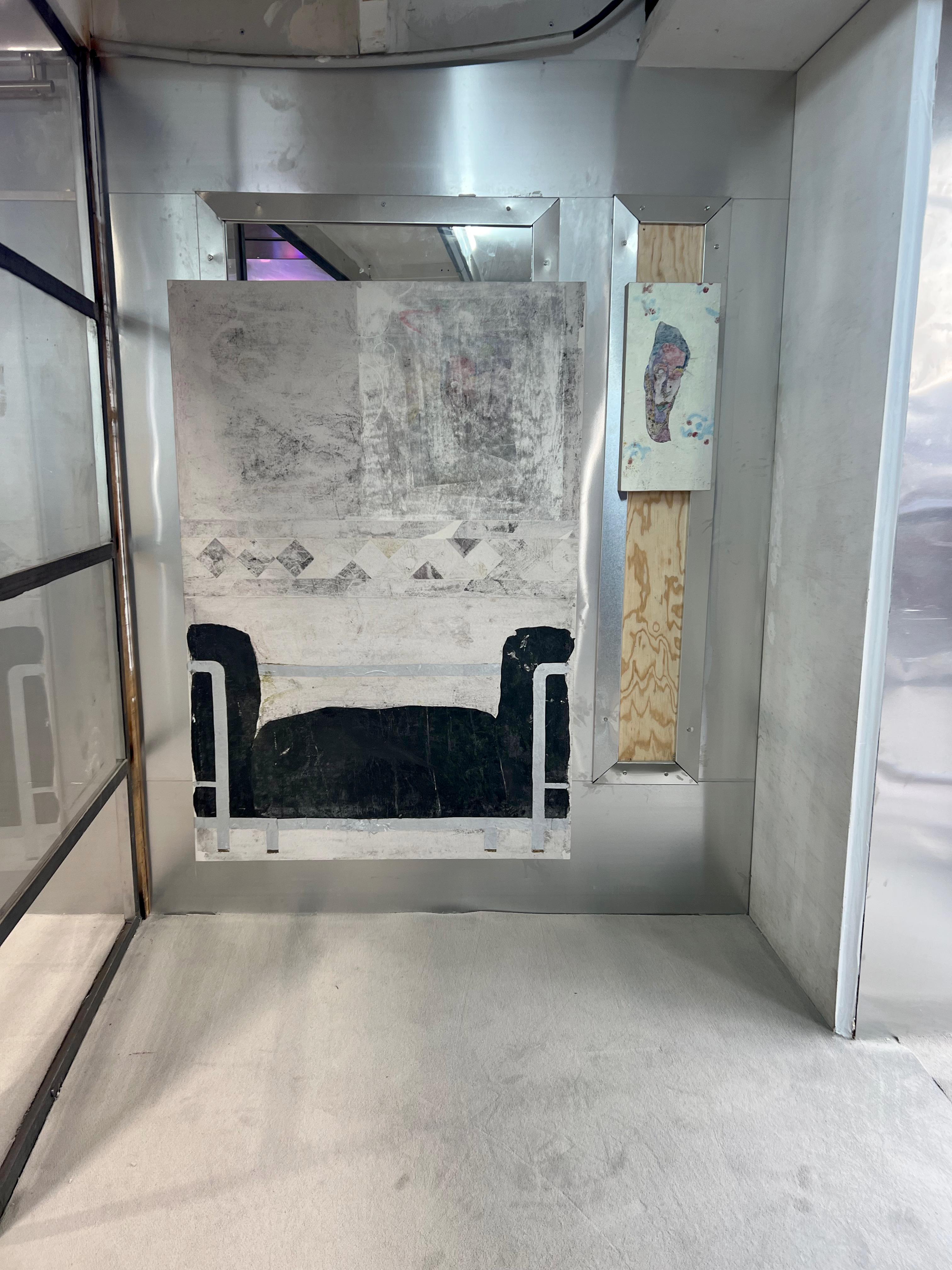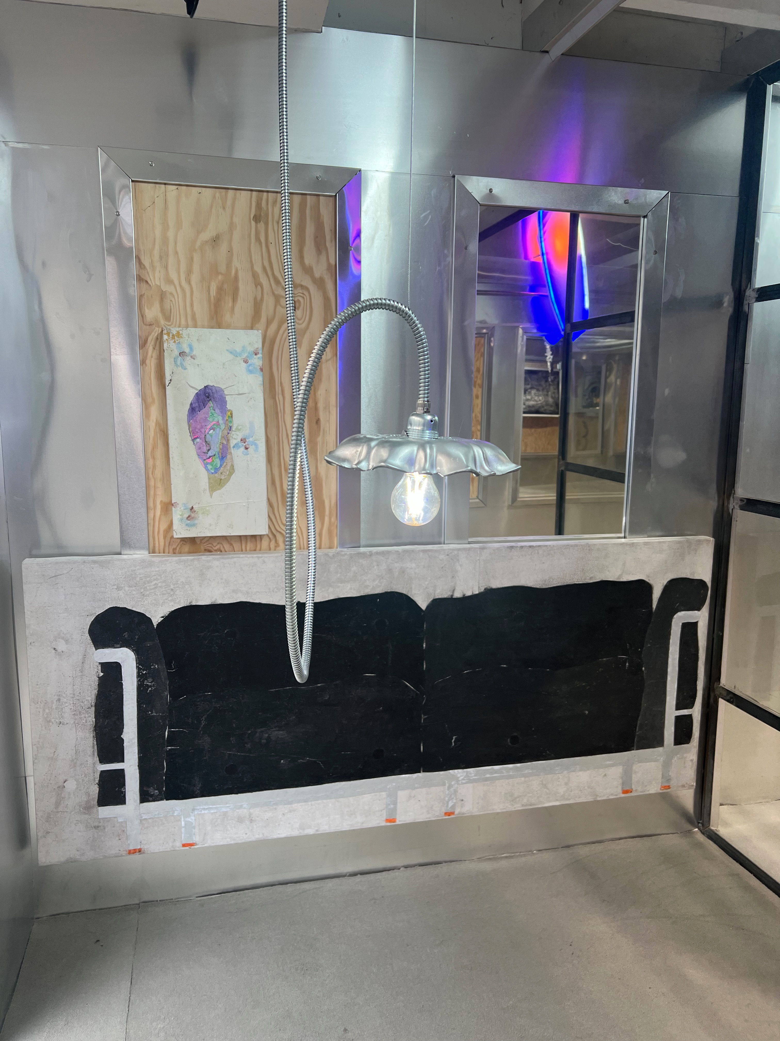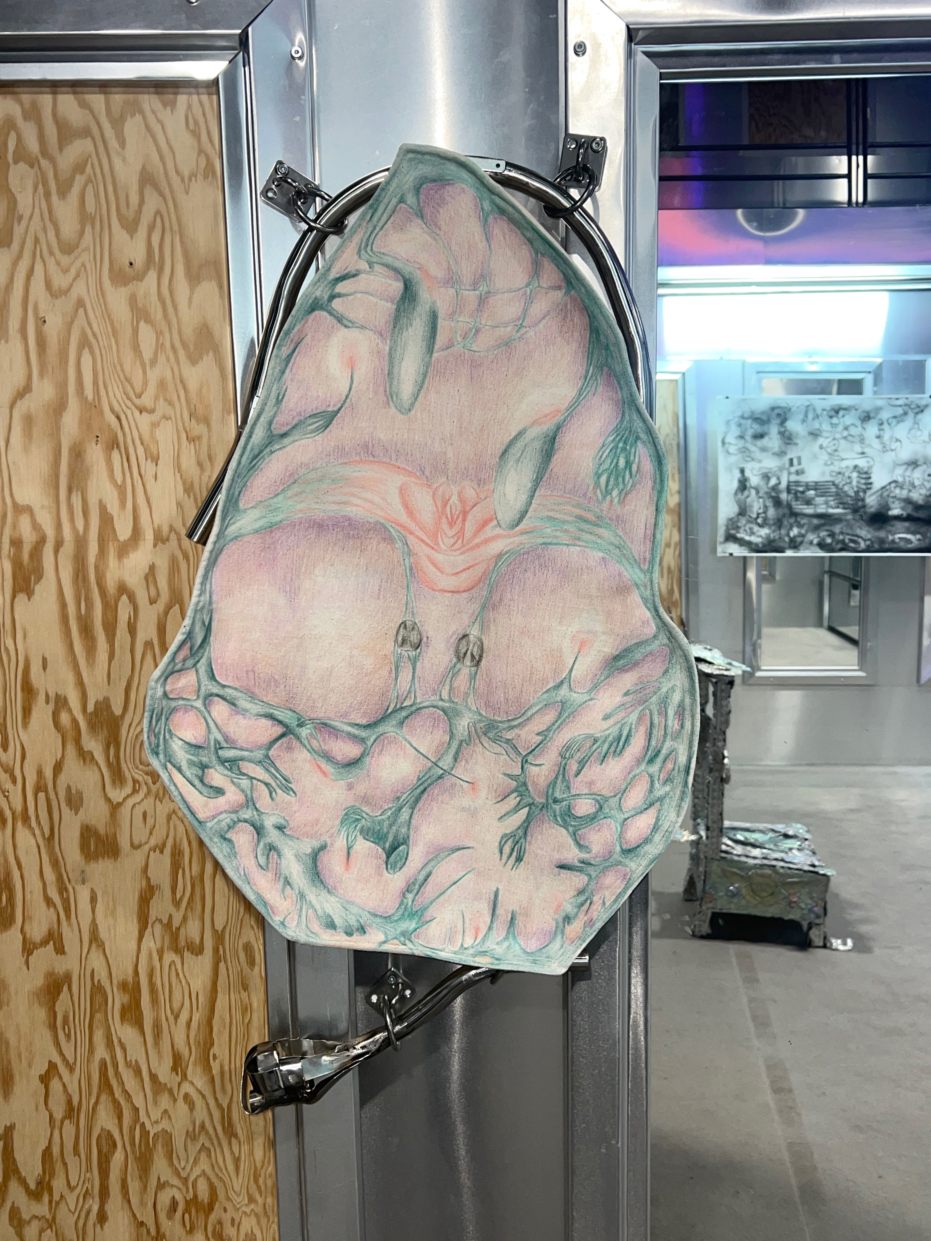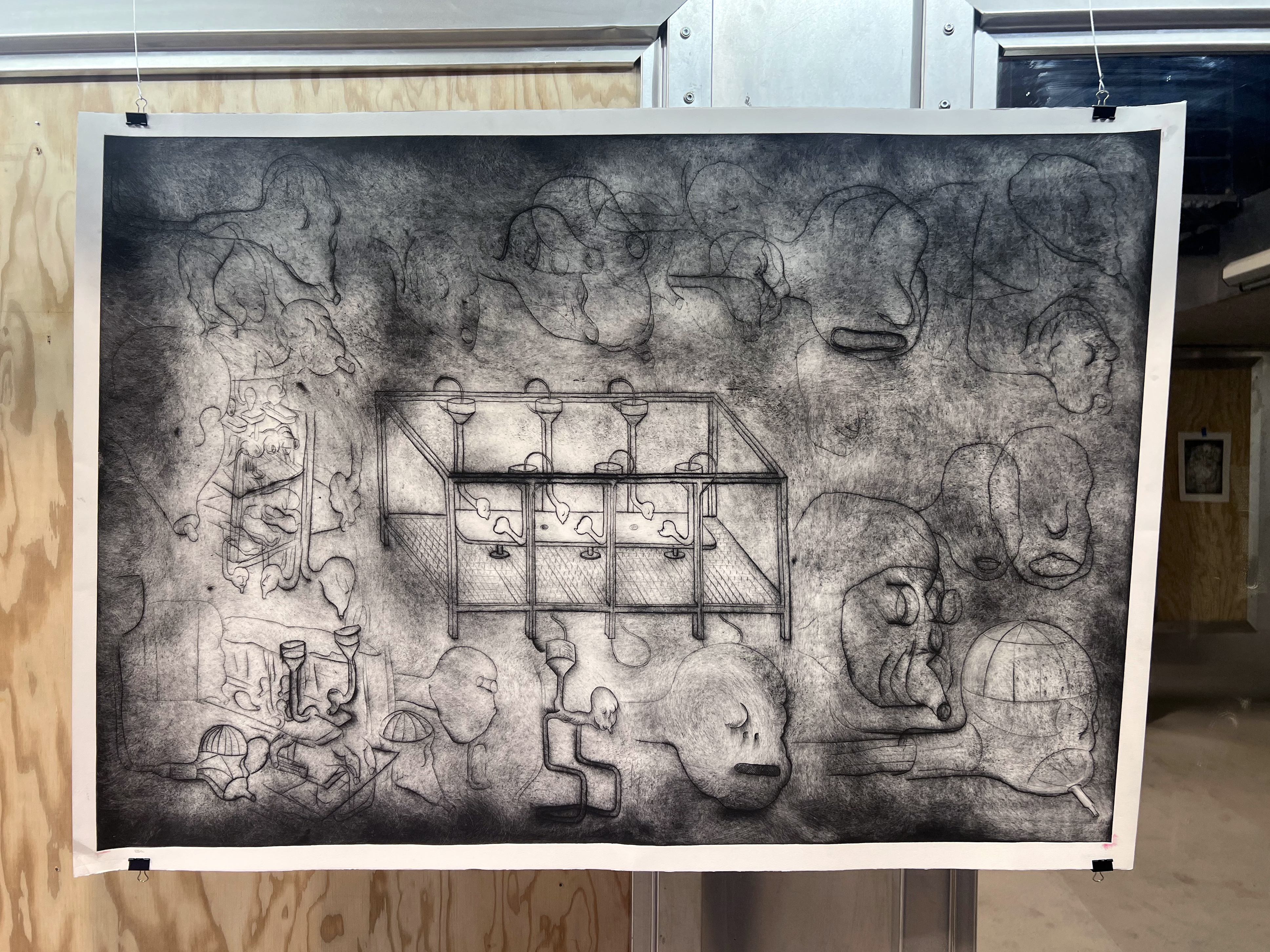 Société Étrange, Marseille 08/01/2026 - 01/02/2026 Une carte blanche à Jean-Baptiste Janisset qui invite Naomi Maury, Antoine Nessi, Paul Paillet Texte de Camille Velluet L’exposition imaginée par Jean-Baptiste Janisset ménage un espace de repos – physique et psychique –, de redescente possible face à une certaine accélération qui parasite nos modes de vie, une perte de repères imposée dans un lieu à la fois clinique et chaleureux. C’est de cette ambivalence dont s’imprègnent les artistes invité·es dans une exposition qui se conçoit comme un asile pour se préserver de maux visibles comme imperceptibles. Il s’agit alors d’ouvrir la voie à une forme d’exorcisme ou d’échappatoire pour se confronter à d’autres temporalités et explorer différents dérivatifs, pratiques, croyances ou stratégies de repli pour habiter ou s’abstraire d’un monde sans dessus dessous. Les fauteuils de Paul Paillet prolongent une série précédente qui évoque des micro-sociétés vivant en vase clos, assises ou allongées dans des canapés, sans réel contact avec l’extérieur. Échos à différentes expériences personnelles et intimes, ses peintures rappellent aussi la salle d’attente, le sas qui précède la consultation ou encore le divan sur lequel on s'épanche. Ces assises, qui par essence impliquent un usage solitaire, tout comme les sculptures lumineuses de l’artiste, suggèrent un espace liminaire, une antichambre entre le lieu domestique suranné et le cabinet du thérapeute. Ces lampes de Paul Paillet résonnent avec les halos luminescents de Naomi Maury. Dérivant de cellules que l’on retrouve chez tous les êtres vivants, ses formes organiques renvoient aux médecines parallèles comme la luminothérapie. Plus largement, la pratique de l’artiste interroge la manière dont nous prenons soin et entretenons les corps pour déjouer leur obsolescence programmée. Naomi Maury étudie comment, dans une logique ultra-tayloriste, la médecine actuelle tend à repousser nos limites physiologiques et en quoi divers objets high-tech viennent prolonger et transformer nos membres de manière quasi prothétique. Les dessins sur gravures d’Antoine Nessi préfigurent les environnements sculpturaux qu’il conçoit. Ils déploient des visions dystopiques qui présagent d’un avenir dans lequel le peuple serait abreuvé d’un lait apte à diffuser une pensée fasciste. Ce liquide coule à flots à travers différents robinets et auges proches de celles présentes dans les abattoirs et les élevages intensifs. Dans cet univers, le mobilier implique une aliénation des corps et tout semble mis en place pour orchestrer un aveuglement des esprits selon un système de pouvoir oppressif. Ces tableaux qui se font le reflet d’un inconscient collectif s’apparentent à des simulations d’un futur à plus ou moins court terme ou d’un présent qui endort nos consciences. Le trône de Jean-Baptiste Janisset émane d’un prie-dieu récupéré aux alentours de Marseille. Témoin d’une histoire à laquelle s'agrègent des fragments de monuments prélevés par l’artiste dans différents lieux souvent liés au culte, cet objet devenu syncrétique revêt divers régimes ornementaux empreints de charges symboliques. Désormais dénué d’une dimension liturgique, il se teinte pourtant d’une force mystique aux vertus curatives. À travers différents registres, les travaux réunis dans ce lieu cultivent une zone de friction au sein de laquelle corps et esprits cheminent entre perte de contrôle et état de veille. De manière plus ou moins équivoque, les pièces participent à la création d’une atmosphère nébuleuse qui permet d’accéder à différents états de conscience. L’exposition aborde la notion de soin dans une dimension tour à tour médicinale et ésotérique. À une époque où le progrès scientifique pousse les corps à toujours plus de performativité, où les substances chimiques font office de loisir récréatif comme de palliatif réconfortant, où une existence sous sédatif paraît presque constituer un mode de vie enviable, L’esprit en thérapie interroge nos manières de nous acclimater à un monde qui semble désynchronisé, entre fuite en avant et quête de guérison.