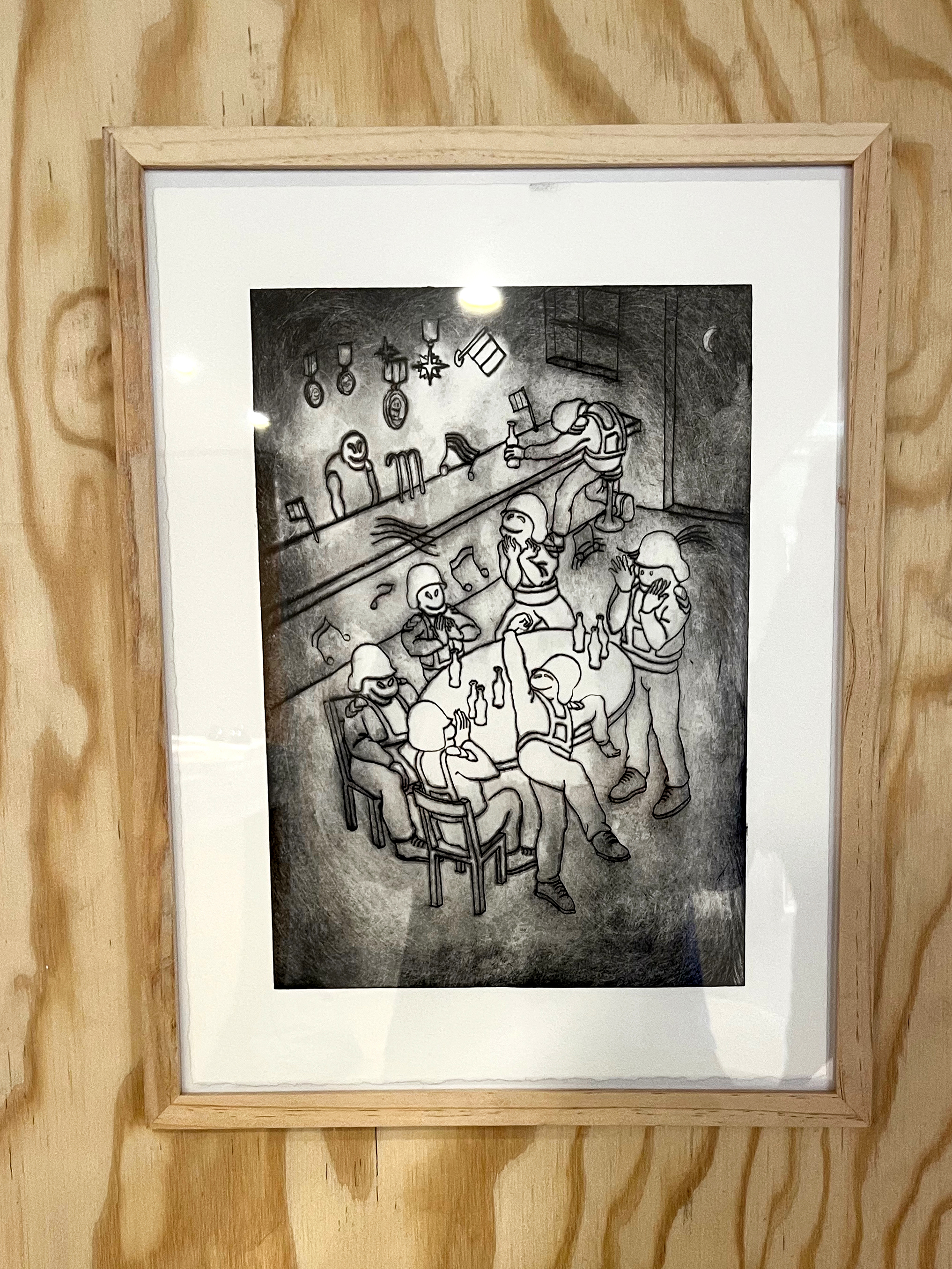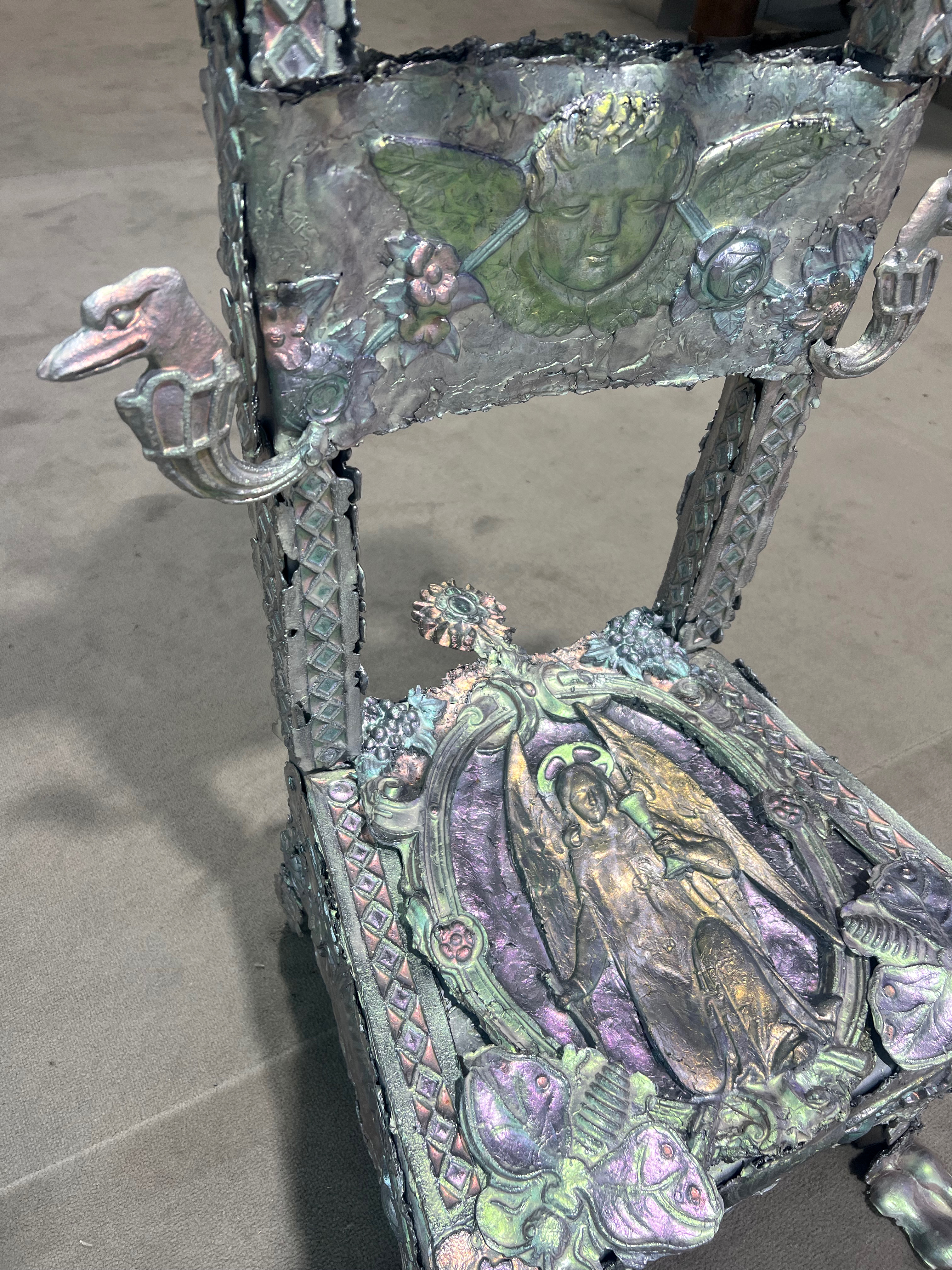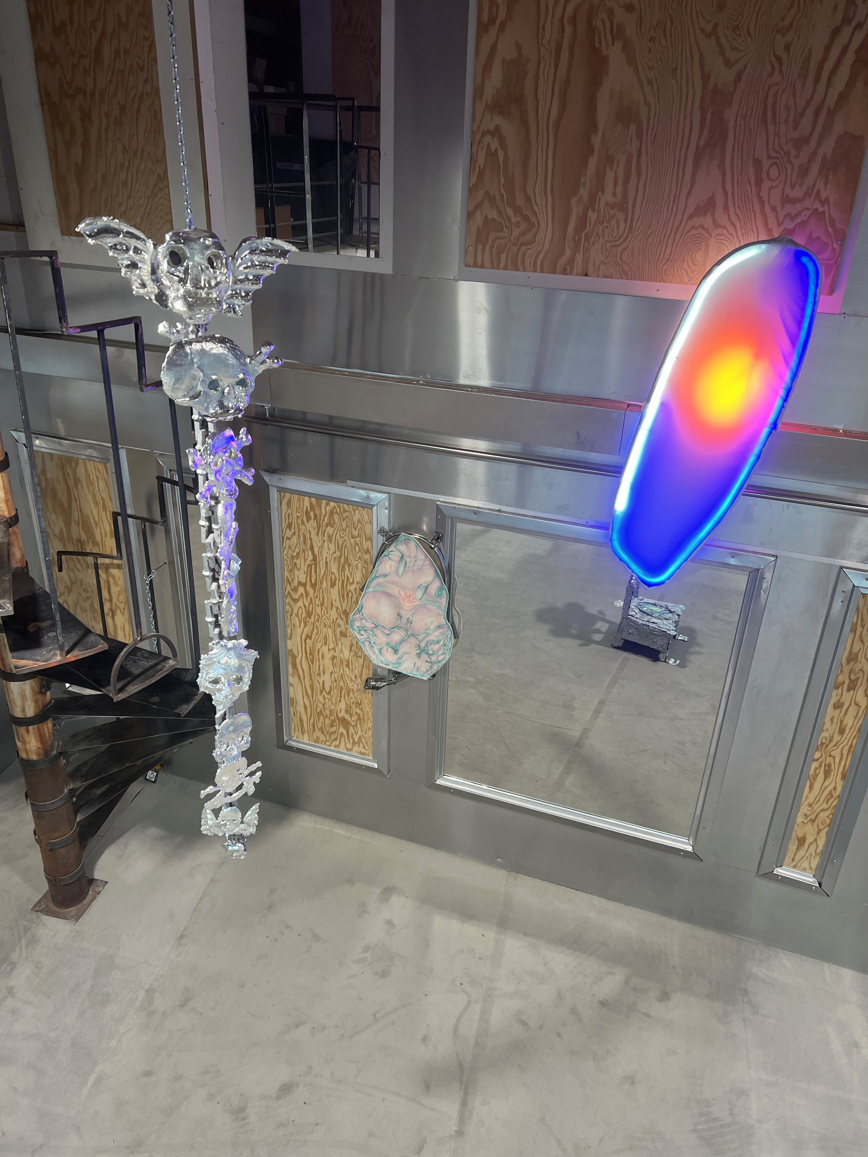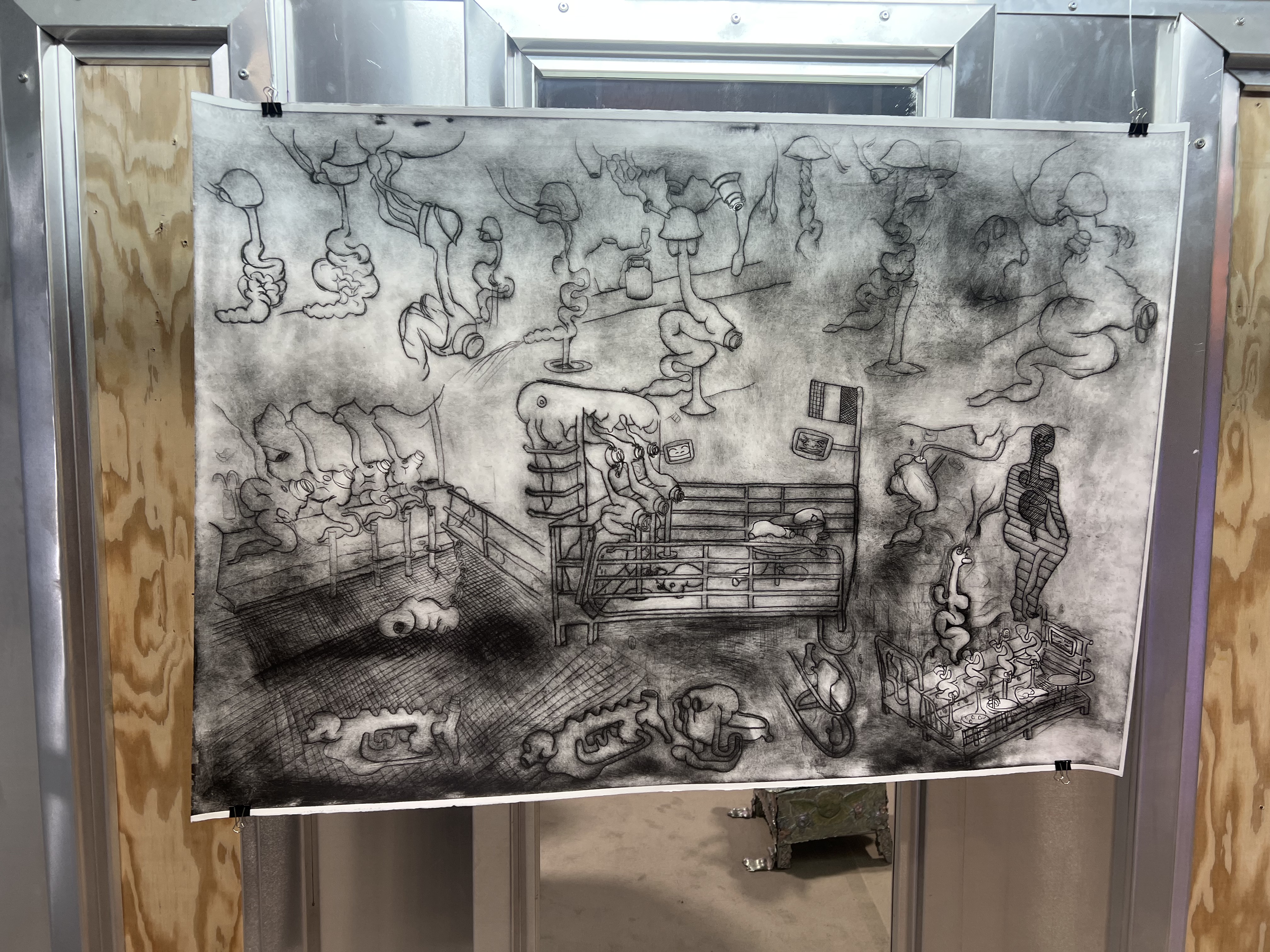 Société Étrange, Marseille 08/01/2026 - 01/02/2026 Une carte blanche à Jean-Baptiste Janisset qui invite Naomi Maury, Antoine Nessi, Paul Paillet Texte de Camille Velluet L’exposition imaginée par Jean-Baptiste Janisset ménage un espace de repos – physique et psychique –, de redescente possible face à une certaine accélération qui parasite nos modes de vie, une perte de repères imposée dans un lieu à la fois clinique et chaleureux. C’est de cette ambivalence dont s’imprègnent les artistes invité·es dans une exposition qui se conçoit comme un asile pour se préserver de maux visibles comme imperceptibles. Il s’agit alors d’ouvrir la voie à une forme d’exorcisme ou d’échappatoire pour se confronter à d’autres temporalités et explorer différents dérivatifs, pratiques, croyances ou stratégies de repli pour habiter ou s’abstraire d’un monde sans dessus dessous. Les fauteuils de Paul Paillet prolongent une série précédente qui évoque des micro-sociétés vivant en vase clos, assises ou allongées dans des canapés, sans réel contact avec l’extérieur. Échos à différentes expériences personnelles et intimes, ses peintures rappellent aussi la salle d’attente, le sas qui précède la consultation ou encore le divan sur lequel on s'épanche. Ces assises, qui par essence impliquent un usage solitaire, tout comme les sculptures lumineuses de l’artiste, suggèrent un espace liminaire, une antichambre entre le lieu domestique suranné et le cabinet du thérapeute. Ces lampes de Paul Paillet résonnent avec les halos luminescents de Naomi Maury. Dérivant de cellules que l’on retrouve chez tous les êtres vivants, ses formes organiques renvoient aux médecines parallèles comme la luminothérapie. Plus largement, la pratique de l’artiste interroge la manière dont nous prenons soin et entretenons les corps pour déjouer leur obsolescence programmée. Naomi Maury étudie comment, dans une logique ultra-tayloriste, la médecine actuelle tend à repousser nos limites physiologiques et en quoi divers objets high-tech viennent prolonger et transformer nos membres de manière quasi prothétique. Les dessins sur gravures d’Antoine Nessi préfigurent les environnements sculpturaux qu’il conçoit. Ils déploient des visions dystopiques qui présagent d’un avenir dans lequel le peuple serait abreuvé d’un lait apte à diffuser une pensée fasciste. Ce liquide coule à flots à travers différents robinets et auges proches de celles présentes dans les abattoirs et les élevages intensifs. Dans cet univers, le mobilier implique une aliénation des corps et tout semble mis en place pour orchestrer un aveuglement des esprits selon un système de pouvoir oppressif. Ces tableaux qui se font le reflet d’un inconscient collectif s’apparentent à des simulations d’un futur à plus ou moins court terme ou d’un présent qui endort nos consciences. Le trône de Jean-Baptiste Janisset émane d’un prie-dieu récupéré aux alentours de Marseille. Témoin d’une histoire à laquelle s'agrègent des fragments de monuments prélevés par l’artiste dans différents lieux souvent liés au culte, cet objet devenu syncrétique revêt divers régimes ornementaux empreints de charges symboliques. Désormais dénué d’une dimension liturgique, il se teinte pourtant d’une force mystique aux vertus curatives. À travers différents registres, les travaux réunis dans ce lieu cultivent une zone de friction au sein de laquelle corps et esprits cheminent entre perte de contrôle et état de veille. De manière plus ou moins équivoque, les pièces participent à la création d’une atmosphère nébuleuse qui permet d’accéder à différents états de conscience. L’exposition aborde la notion de soin dans une dimension tour à tour médicinale et ésotérique. À une époque où le progrès scientifique pousse les corps à toujours plus de performativité, où les substances chimiques font office de loisir récréatif comme de palliatif réconfortant, où une existence sous sédatif paraît presque constituer un mode de vie enviable, L’esprit en thérapie interroge nos manières de nous acclimater à un monde qui semble désynchronisé, entre fuite en avant et quête de guérison.